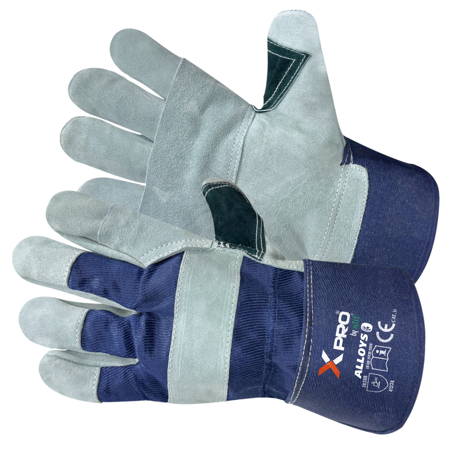 Palm Cowsplit leather palm with cow split leather reinforcement on palm, thumb and back, blue fabric back with extended cuff, palm with fleece lined.