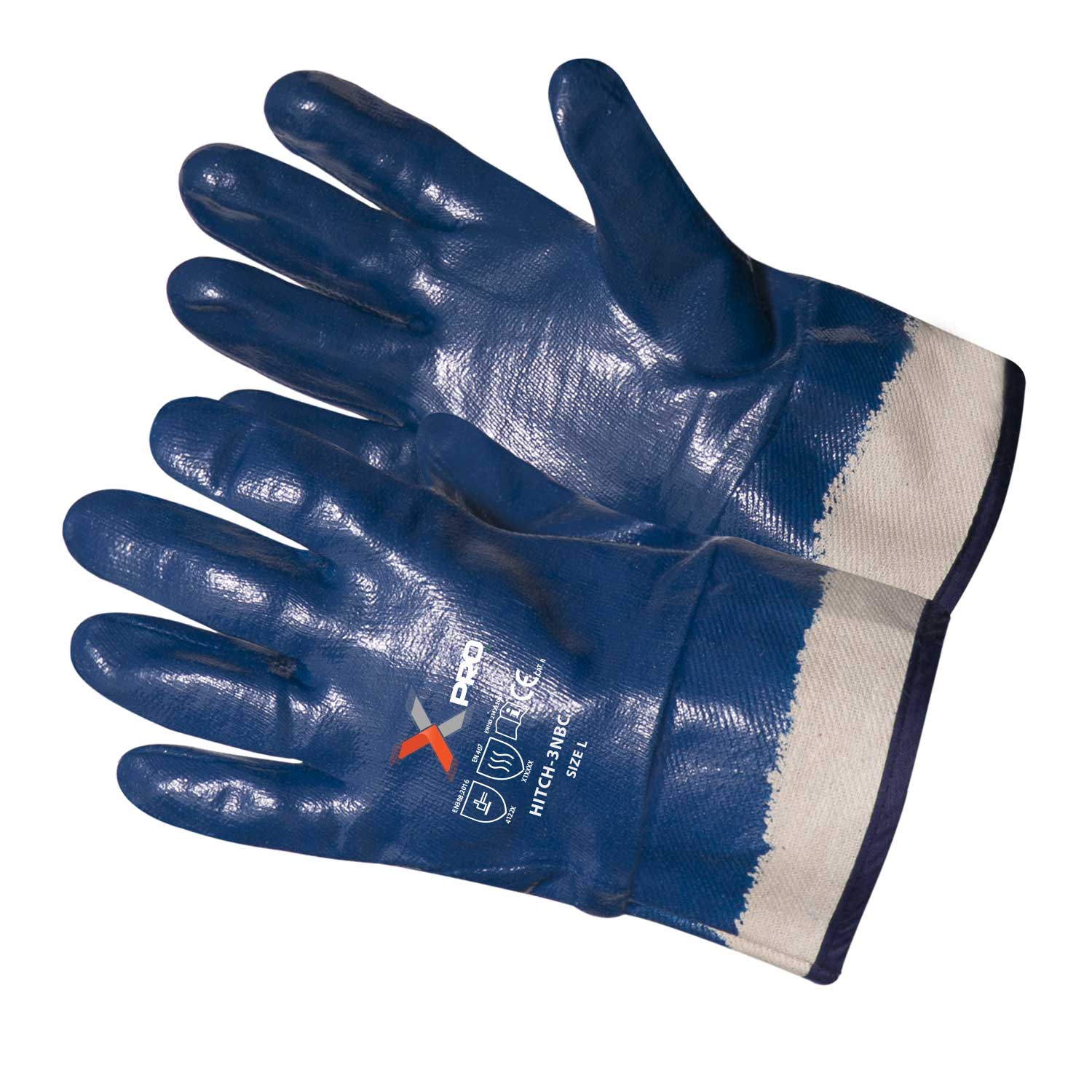 Aitrile dipped glove, fully coated style, jersey lined, plasticized safety cuff with blue color binding. Double dipped.