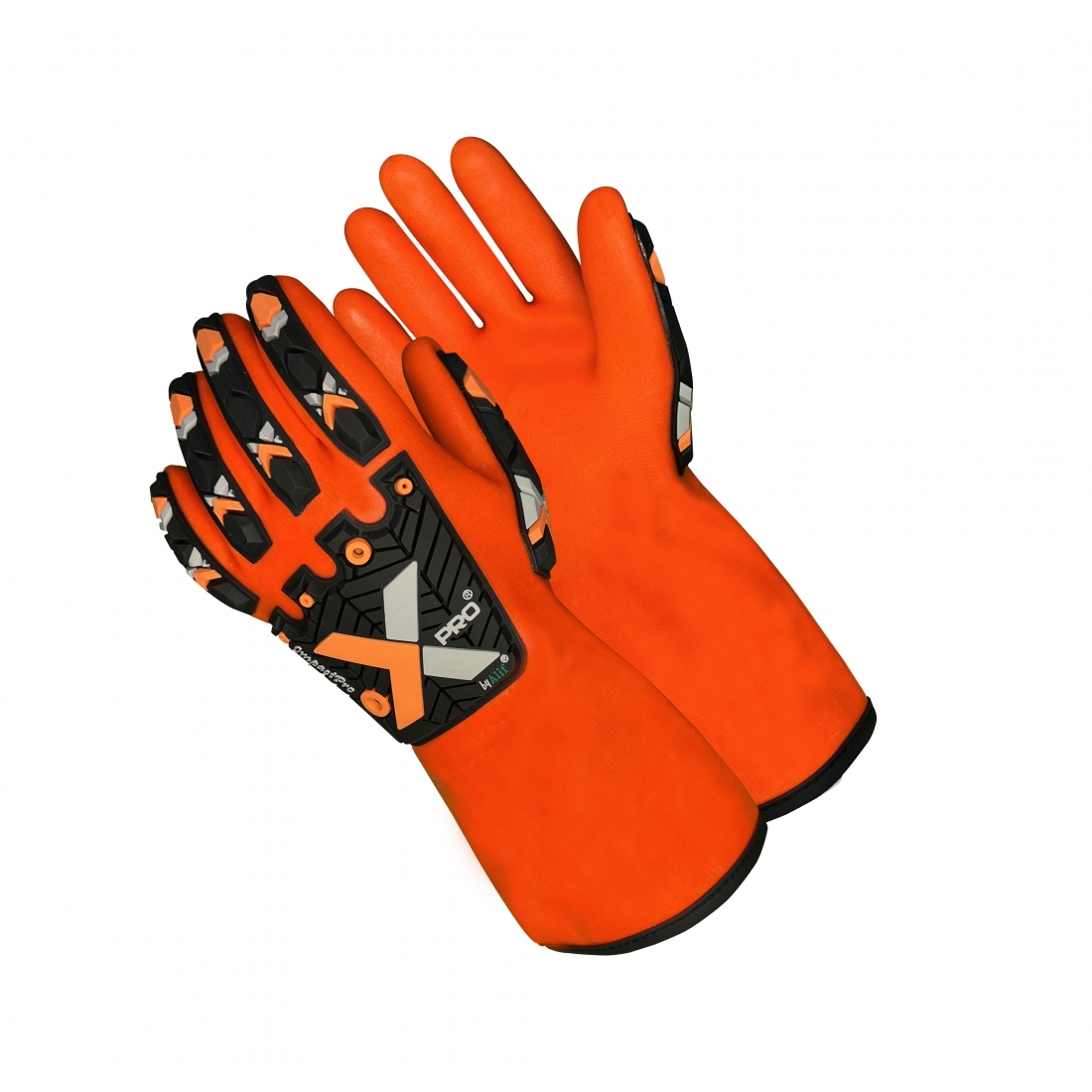 Cut, Chemical and Impact resistant gloves Long-length PVC fully coated gauntlet with rough finish on palm on a nylon composite liner, Superior flexibility. Excellent protection in wet application, dry and oil grip Cut level ANSI A4 and Impact level 2